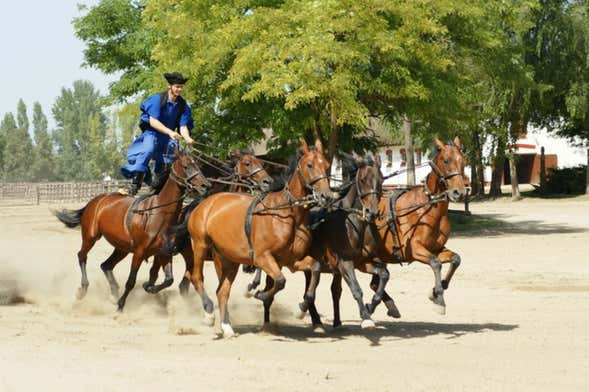 At the end of the ride, you'll see a traditional equestrian show where the riders will show off their expertise on horseback. Before finishing the excursion, we'll enjoy a delicious three-course traditional Hungarian meal with a drink in a rustic Csárda, accompanied by the sound of traditional music!